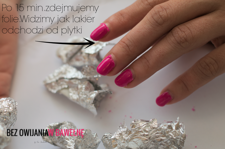 Przy użyciu nasączonych płatków bezpyłowych acetonem- remover i zawiniętych folią aluminiową.